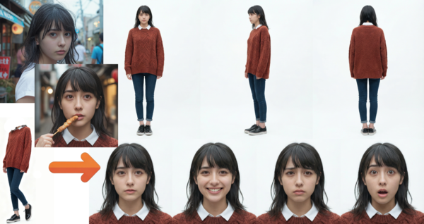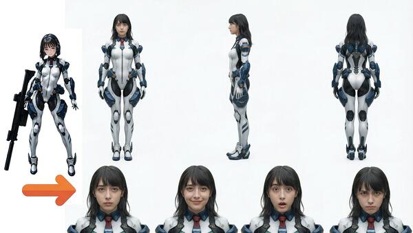 これにより、三面図と表情差分が作成されます。「実写・写真風」の部分を「イラスト風」にするだけで、イラスト風の出力にもなります。そして、一度、三面図情報を作成してしまえば、多様な出力が可能になります。