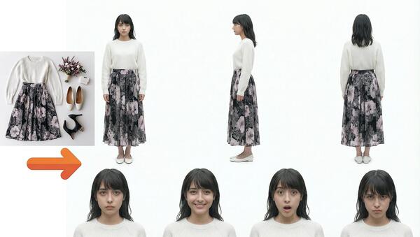そもそも、Nano Banana Proは画像参照能力が極めて高く、人物やキャラクターの三面図や表情差分の作成が劇的に簡単になっています。この連載に登場するAIモデル「明日来子さん」の三面図と表情差分を作成してみることにします。画像は、アップの顔3枚と服装のみの画像1枚を入力画像として用い、プロンプトは次のもので生成しています。成功のコツは年齢と身長を入れて指定しておくことです。