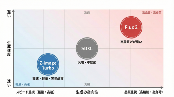 Z-Image Turboを位置付けるうえでは、「どのモデルが一番すごいか」ではなく、「どのモデルがどんな前提と用途に向いているか」で比較するのが現実的だ。ここでは、Flux 2、SDXLという現在の代表的モデルと並べて、実用面での違いを整理する。