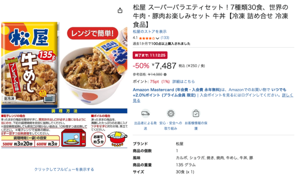 松屋の人気メニューをまとめた冷凍アソート「スーパーバラエティセット」がAmazonセールに登場。30食入りの大容量セットが参考価格14,980円のところ、50%オフの7,487円で購入できる。牛めし、焼肉、豚生姜焼きなど、松屋の定番を一度に楽しめる内容だ。
