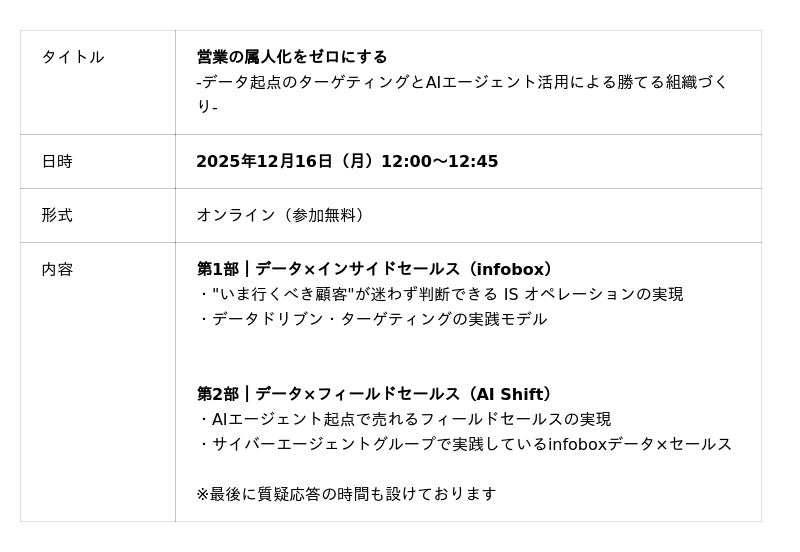株式会社サイバーエージェント(本社:東京都渋谷区、代表取締役:藤田晋、東証プライム市場:証券コード4751)のグループ会社である株式会社AI Shift(本社:東京都渋谷区、代表取締役社長:米山結人、以下AI Shift)は、今アプローチすべき企業とその理由」がわかる、営業データプラットフォームを提供する株式会社インフォボックス(本社:東京都千代田区、代表取締役CEO:平沼 海統)と共同で、インサイドセールスとフィールドセールスの業務をデータを軸に、AIエージェントで進化させる最新オンラインセミナーを開催いたします。