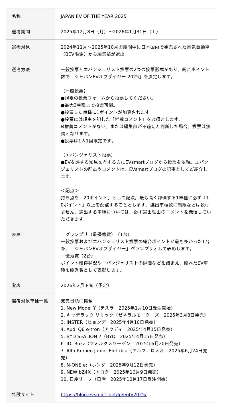 「ジャパンEVオブザイヤー 2025」は、ミライズエネチェンジが運営するEV情報メディア「EVsmartブログ」とその読者がともに、ノミネート車種の中から2025年の顔となる“最優秀EV”を選出するユーザー参加型アワードで、2022年の設立以来第4回を迎えます。