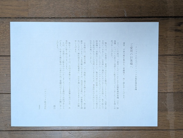 手紙は事務的なコピー用紙ではなく、明らかに質の良い高級用紙に印刷されていました。「ご愛用のお客様へ」と題されたその文面は、単なる事務手続きを超えた、メーカーとしての深い謝罪と誠意をにじませる「ザ・日本企業」と言うべきモノでした。