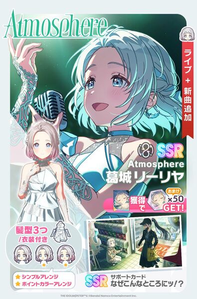 バンダイナムコエンターテインメントが提供するiOS/Android向けアプリ「学園アイドルマスター」(以下、学マス)にて12月8日、新ガシャが開催。プロデュースアイドル「【Atmosphere】葛城リーリヤ」と、新SSRサポートカード「なぜこんなところにッ!?」が登場している。