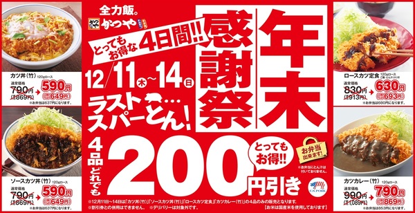 とんかつチェーンの「かつや」は、12月11日~14日の4日間「年末感謝祭」を開催し、人気の4メニューを割引販売します。