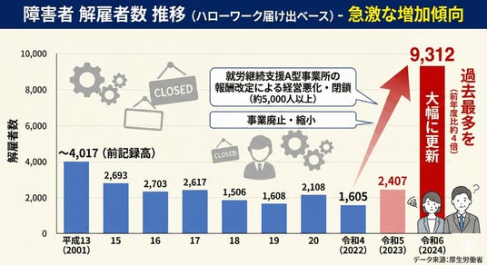 また、就労継続支援A型事業所の廃業も顕著で、障害者雇用における解雇件数も過去最高を記録しました。2024年3月~7月の5ヶ月間で全国329カ所の就労継続支援A型事業所が閉鎖され、少なくとも約5,000人の障害のある方が退職になったと言われています。