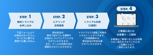 ご契約までの流れは、以下の4ステップになります。まずは無料トライアルにお申込みください。