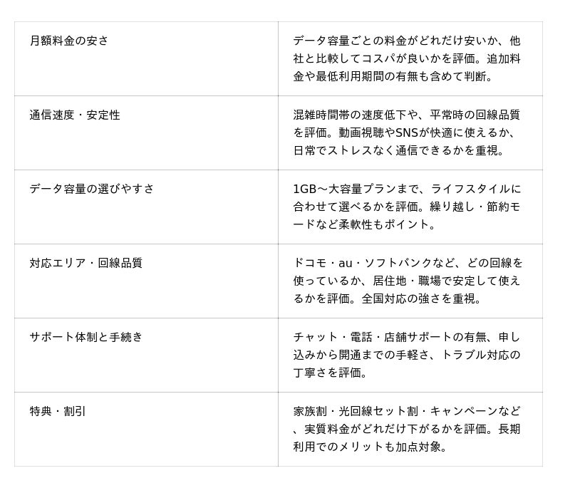 各提供会社については、実際の利用者からの口コミと、当メディアによる独自調査を掛け合わせた格安SIMの総合ランキングを掲載。評価基準の透明性を重視し、「月額料金の安さ」「通信速度・安定性」「データ容量の選びやすさ」など、指標ごとの強み・弱みを可視化しました。これにより、従来の格安SIMランキングでは見えづらかった利用する上でのリアルな評価を、ユーザー目線で提供しています。