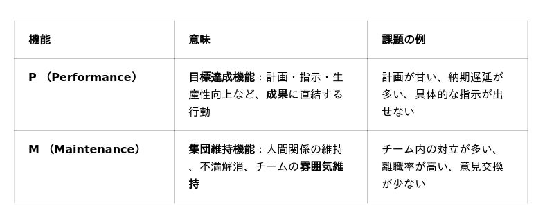 PM理論では、リーダーシップは以下の2つの機能で構成されます。