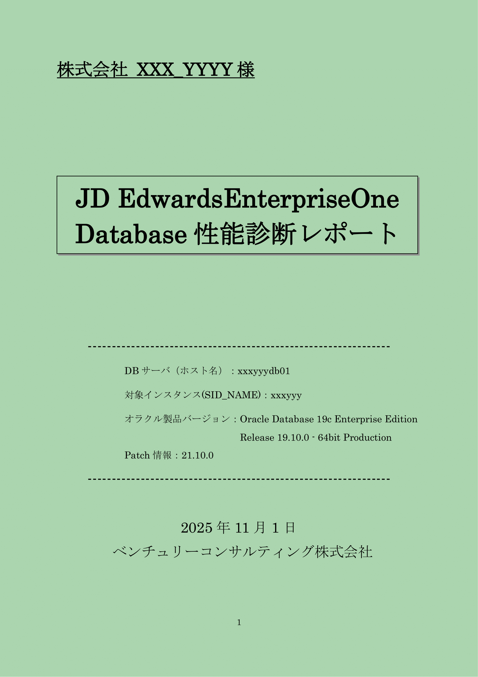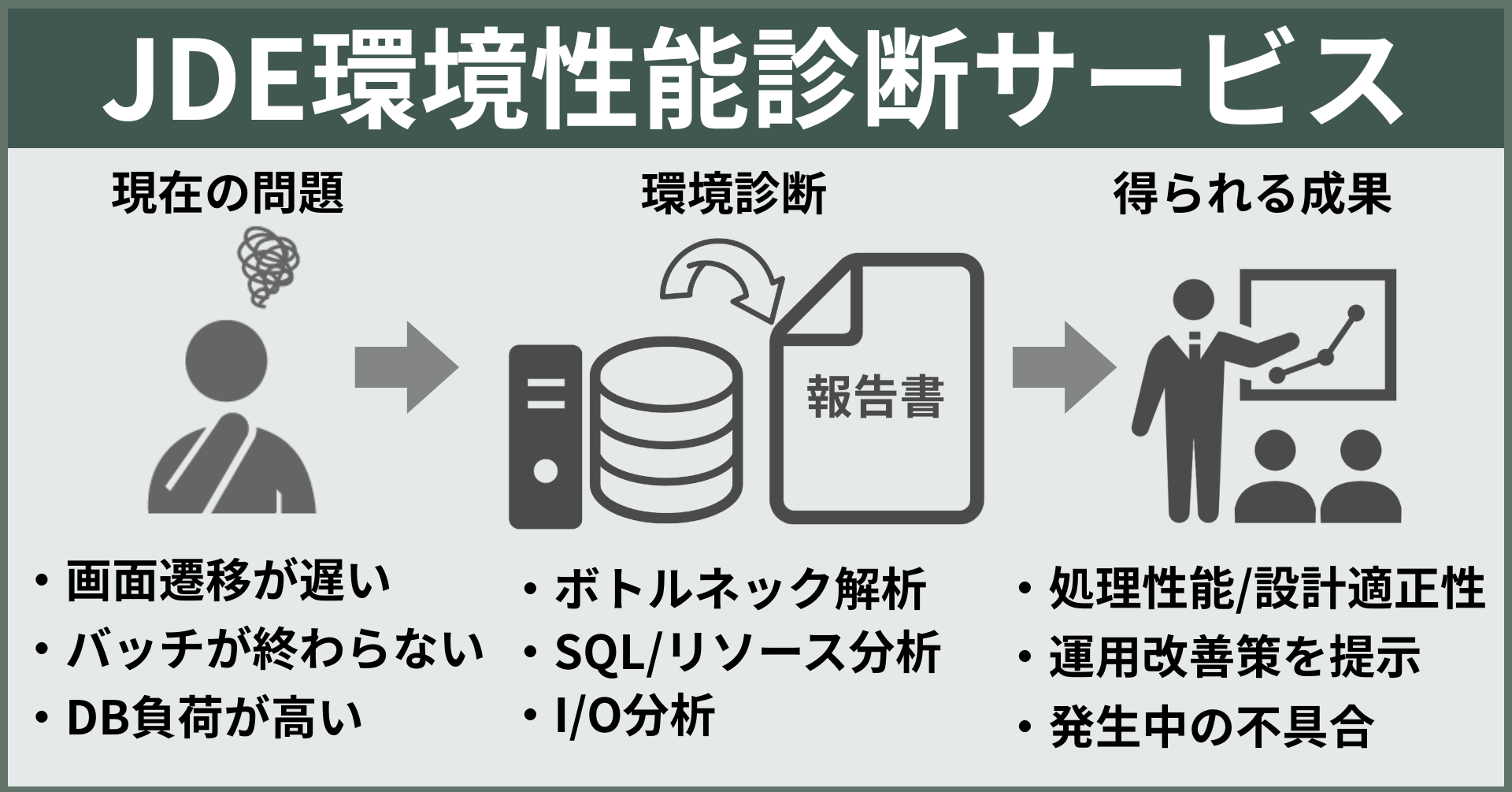 JD Edwards EnterpriseOne(以降JDEと表記)環境で稼働するOracle Databaseの性能測定と設計診断を行い、A4 約10~15ページの詳細なレポートとして結果を報告します。データベースの処理性能・設計の適正性を可視化し、運用の属人化や性能劣化、不具合の兆候を総合的に分析します。加えて、今後必要となる改善策の提示や、具体的対策を実行します。