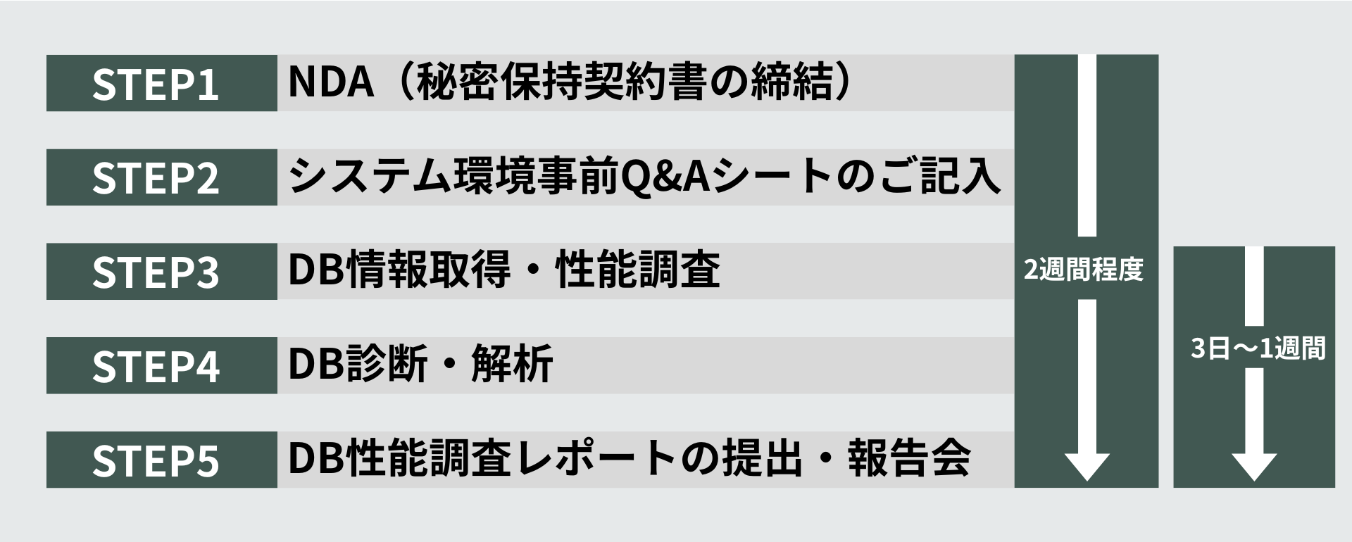 本サービスでは、お客様の環境に負担をかけず、短期間でデータベースの状態を可視化できるよう、診断プロセスを明確に体系化しています。レポート作成までの流れは、以下の5つのステップで進めてまいります。