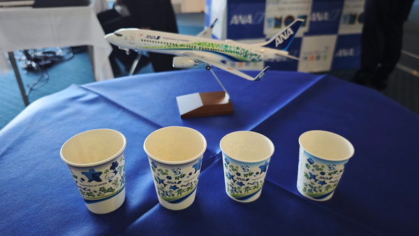 ANA ふるさとJETは、外装だけでなく、客室乗務員が着用するエプロンや、機内で提供される紙コップにも、機体と同様に地域創生をテーマとした特別デザインを採用しています。