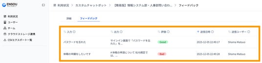 本機能により、カスタムチャットボット(RAG)の回答品質に対する利用者からの評価を収集できるようになり、ボットの作成者はそのフィードバックをもとにナレッジの改善を継続的に行うことが可能になります。