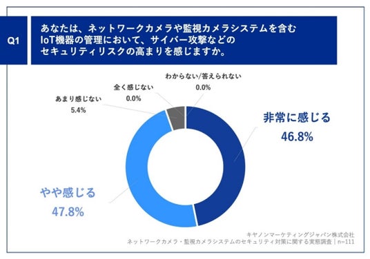 「Q1.あなたは、ネットワークカメラや監視カメラシステムを含むIoT機器の管理において、サイバー攻撃などのセキュリティリスクの高まりを感じますか。」(n=111)と質問したところ、「非常に感じる」が46.8%、「やや感じる」が47.8%という回答となりました。