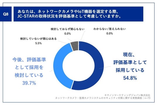 Q7で「内容を理解している」と回答した方に、「Q8.あなたは、ネットワークカメラやIoT機器を選定する際、「JC-STAR」の取得状況を評価基準として考慮していますか。」(n=73)と質問したところ、「現在、評価基準として採用している」が54.8%、「今後、評価基準として採用を検討している」が39.7%という回答となりました。