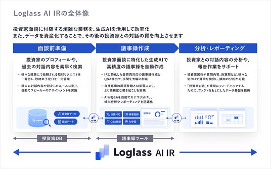 株式会社ログラス(本社:東京都港区、代表取締役:布川 友也、以下 当社)は、「Loglass AI IR」を、本日より正式に提供開始します。「Loglass AI IR」は煩雑なルーティンワークであった従来のIR業務を効率化し、投資家との対話の質を向上するAIソリューションです。さらに、近年複雑化しているIR業務の負担を減らし、IR担当者の戦略的な活動を支援します。