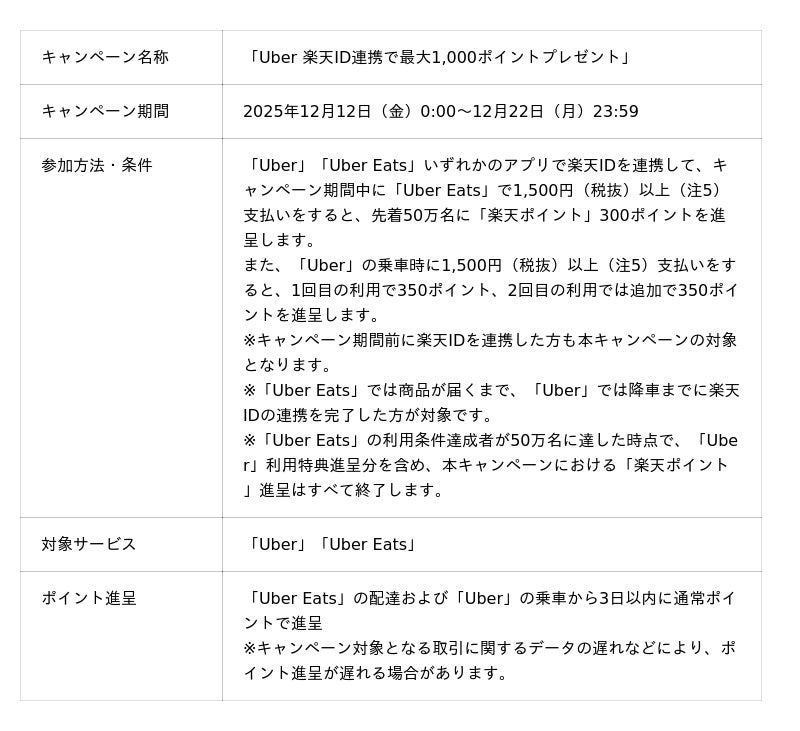 本導入を記念して、2025年12月12日(金)から12月22日(月)まで、「Uber 楽天ID連携で最大1,000ポイントプレゼント」キャンペーンを実施します。