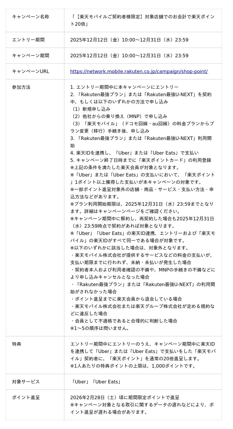 また、現在実施中の「【楽天モバイルご契約者様限定】対象店舗でのお会計で楽天ポイント20倍」キャンペーン(注8)では、2025年12月12日(金)より「Uber」「Uber Eats」が新たに加わります。楽天IDを連携して「Uber」または「Uber Eats」で支払いをした「楽天モバイル」契約者に、「楽天ポイント」を通常の20倍進呈します。