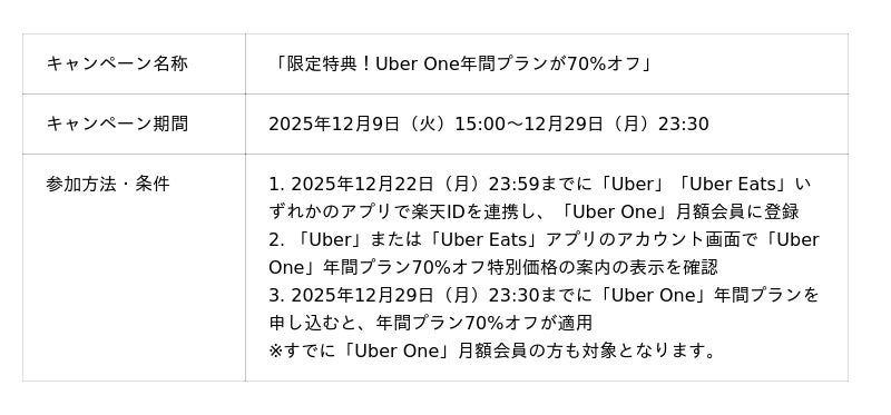 さらに、楽天IDを連携した「Uber One」の月額会員には、年間プラン(3,998円)を70%オフの特別価格で提供します(注9)。