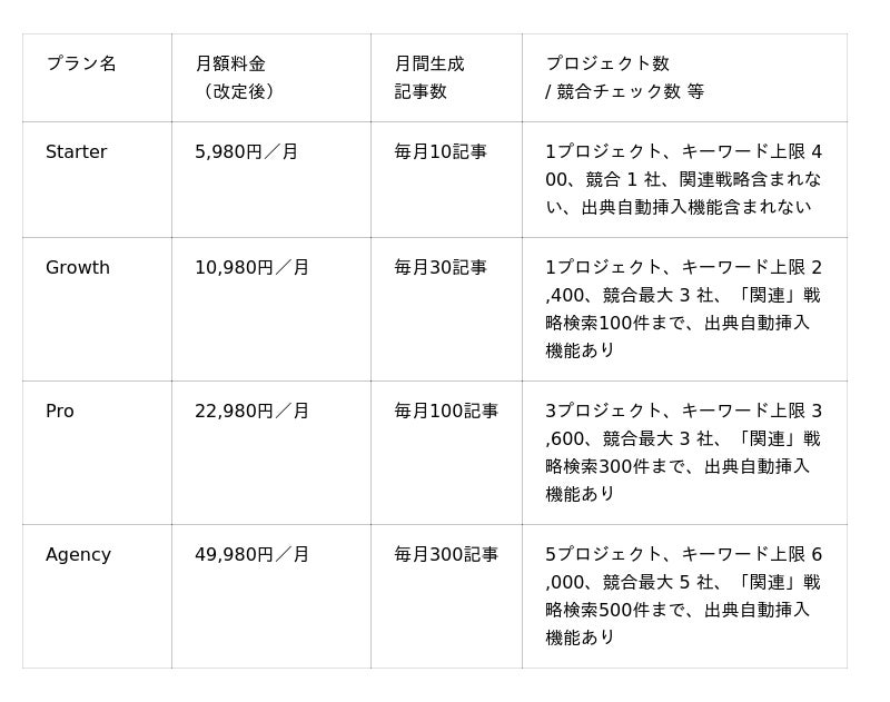 株式会社LaLoka Labs(ラロカラボ)(本社:東京都台東区、代表:イクバル・アバドゥラ)が展開するAIコンテンツ生成・SEO支援ツール「Kafkai」(カフカイ)は、提供する生成品質およびサービスインフラの強化に合わせ、料金体系の見直しを行い、新価格プランの提供を開始しています。本改定により、ユーザーはより高品質で安定した AI コンテンツ生成環境を利用できるようになります。価格改定は、2025年11月3日より開始しています。