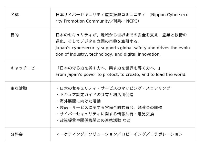 日本サイバーセキュリティ産業振興コミュニティ(NCPC)設立のお知らせ