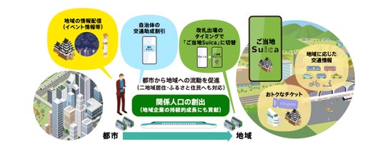 「ご当地Suica」は地域の情報配信チャネルとなり、都市と地域をつなぎます。さらに、二地域居住やふるさと住民へも対応し、都市から地域への関係人口の創出や移住を促進していきます。例えば、自治体からの助成を前提に、地域と都市間の移動や通勤・通学に要する交通費について、その地域独自の割引サービスや二地域居住等へ対応した独自のサービスにも対応できるようになります。
