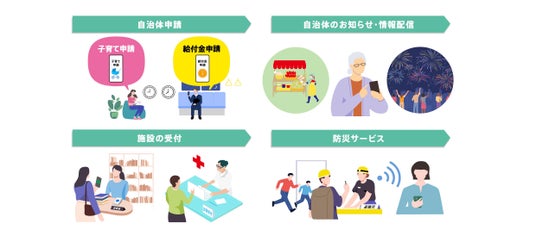 生活サービス機能により、皆さまの地域生活の”不”便や”負”担を解決します。例えば子育て申請において、従来は平日に会社を休み申請書を提出するために自治体窓口に行かなければならないところ、本機能でオンライン申請が可能となるため、時間と場所の制約が無くなります。さらに、給付金申請のほか、自治体からのお知らせや公共施設・医療機関の受付、避難所での入退管理による効率的な救援物資の配布や安否確認等の防災サービスまで、地域生活に不可欠な情報連携・利用サービスを一体で提供することを目指します。