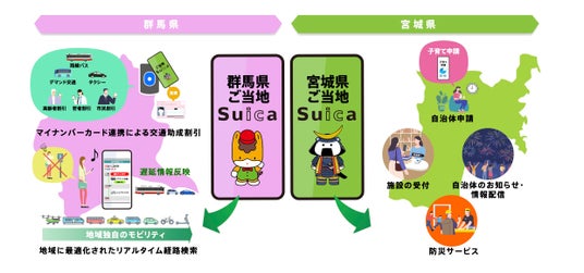 2027年春に群馬県内と宮城県内で「ご当地Suica」を先行スタートします。JR東日本グループのSuica、群馬県で育まれたMaaS(GunMaaS)、宮城県で実装されている生活サービスを組み合わせることで「ご当地Suica」を実現し、両県における新しい当たり前を創ります。