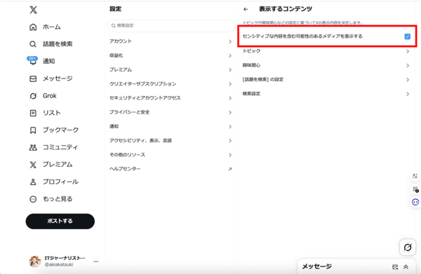 センシティブ投稿の設定手順だが、iPhoneの場合はXアプリからは設定できず、ブラウザから操作することになる。