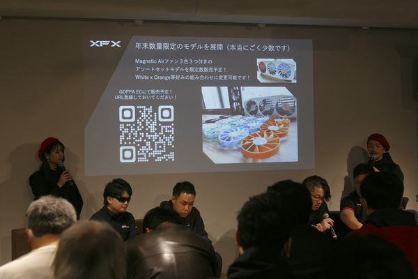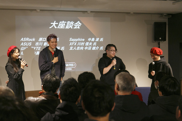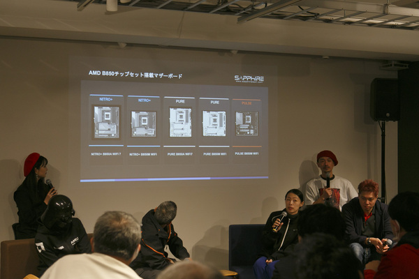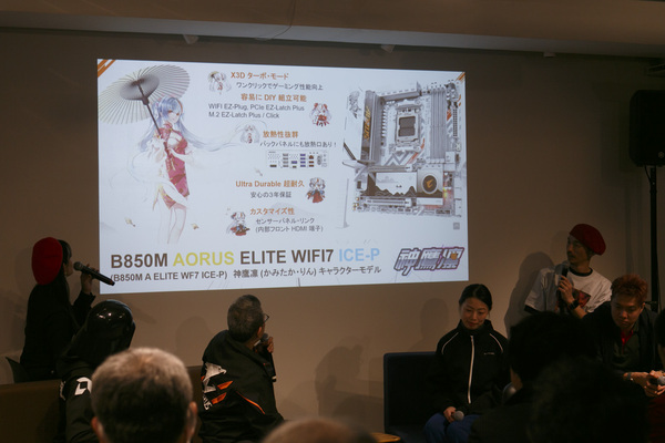 メンバーが入れ替わり、後半戦のPRタイム。ASRockはマザーボード「X870 TAICHI Creator」と「Radeon AI PRO R9700 Creator 32GB」、SapphireはRX 9000シリーズのビデオカードとB850マザーの多彩なラインナップを紹介した。GIGABYTEはマザーボード「X870E Aorus Master X3D ICE」や「B850M Aorus ELITE WIFI7 ICE-P 神鷹凛キャラクターモデル」などの製品をスクリーンに映し出して解説した。