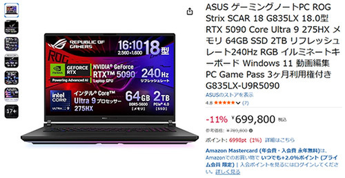 ASUSのフラッグシップゲーミングノートPC「ROG Strix SCAR 18 G835LX」が、Amazonセールに登場しました。参考価格789,800円のところ、11%オフの699,800円という魅力的な価格となっています。