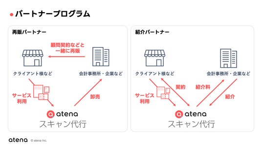 例えば、クライアント様の証憑をatenaに直接お送りいただく利用形態はもちろん、卸売販売契約で貴社へ卸売し顧問先様やエンドユーザー様に再販してご利用いただくこともできます。