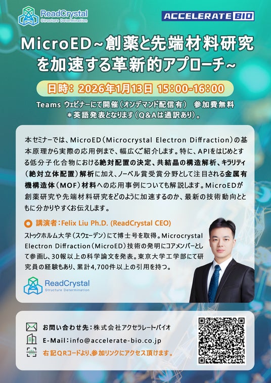 【セミナー開催のお知らせ】MicroED~創薬と先端材料研究を加速する構造解析アプローチ~ 第二回アクセラレート・バイオセミナー