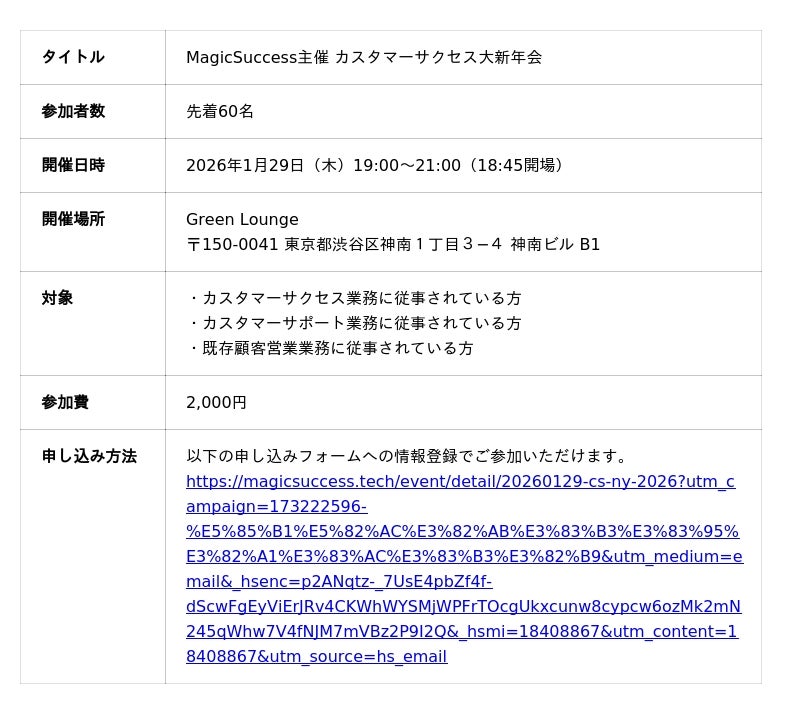 事業成長をリードする強いCS組織を作るカスタマーサクセスプラットフォーム「MagicSuccess(マジックサクセス)」を提供する株式会社UPDATA(本社:東京都港区、代表取締役:岡村雅信)は、2026年1月29日(木)に、カスタマーサクセス職を対象とした大新年会を開催いたします。