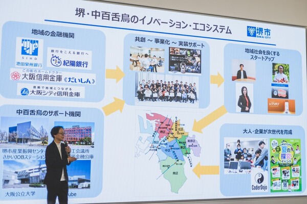 本屋氏は、堺市が中百舌鳥エリアをイノベーションの中心とする意図や、行政・大学・金融機関・産業支援機関との連携による同市の取り組み、そして大阪・関西万博で実施したスタートアップの紹介や子ども向けプログラミング展示に触れながら、「ここ中百舌鳥から、子どもたちの未来や社会課題の解決につながる流れをつくっていきたい」と抱負を語った。