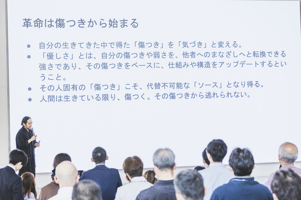 「自分が生きてきた中で得た『傷つき』を『気づき』へと変える」こと、「『優しさ」とは、自分の傷つきや弱さを、他者へのまなざしへと転換できる強さであり、その傷つきをベースに、仕組みや構造をアップデートするということ」と示し、来場者たちに力強いエールを送った。