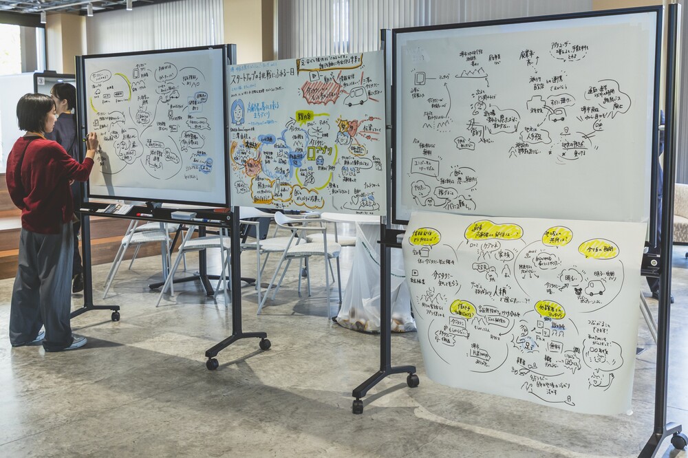 議論の内容は、その場でグラフィックファシリテーターが文字とイラストで即座に記録。ワークショップ終了後には、見た目にもわかりやすい成果物として会場に示された。