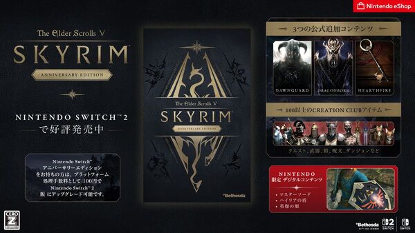 Nintendo Switch 2版の「The Elder Scrolls V: Skyrim Anniversary Edition」では、ゲーム本編と3つの公式拡張コンテンツをすべて収録。クエストや武器、鎧、呪文、ダンジョンなど冒険を彩る数百種類のCreation Clubアイテムが含まれている。