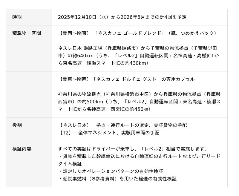 ネスレ日本株式会社(本社:兵庫県神戸市、代表取締役 社長 兼 CEO:深谷 龍彦、以下「ネスレ日本」)と株式会社T2(本社:東京都千代田区、代表取締役 CEO:熊部 雅友、以下「T2」)は、T2が開発した自動運転トラックを用いて、高速道路上で「ネスカフェ」を輸送する実証を、2025年12月10日(水)から開始します。