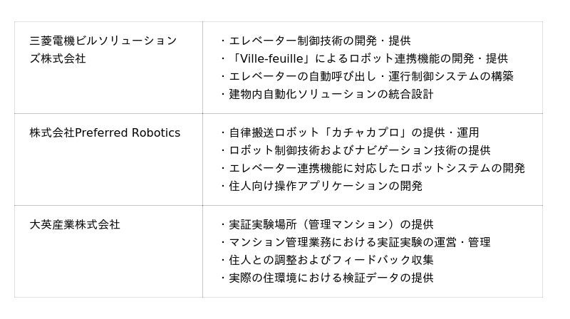 三菱電機ビルソリューションズ、Preferred Robotics、大英産業の3社が連携することで、エレベーターの制御技術、自律搬送ロボットの開発・製造、マンション管理のノウハウといった各社が保有する豊富な知見を実用性の高いソリューション開発に活かし、高齢化社会、物流問題や人手不足などさまざまな社会課題の解決に貢献するサービスの確立を目指します。