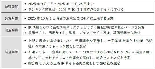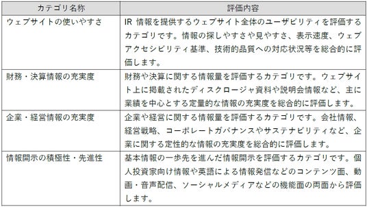 当社では、国内の上場企業が提供するIRサイト(株主・投資家向け情報サイト)の使いやすさや情報の充実度評価を目的としてランキング調査を行っています。「ウェブサイトの使いやすさ」「財務・決算情報の充実度」「企業・経営情報の充実度」「情報開示の積極性・先進性」の4つのカテゴリから構成される評価項目は、主要ユーザーである株主や投資家の視点を中心に設定しています。評価項目は、開示等に係る制度動向や社会的関心等を踏まえ毎年見直しを実施しており、当社アナリストが最新の評価項目をもとに行った調査結果を、総合的に優れたIRサイトのランキングとして発表しています。