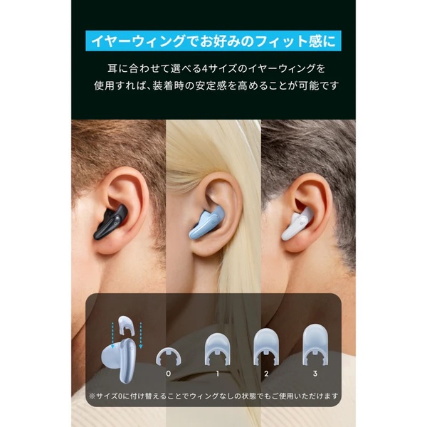 インナーイヤー型には「外れやすい」という欠点がありますが、Soundcore Liberty Budsはイヤーウィング(耳の内側に引っ掛ける小さなパーツ)でこの弱点を見事にカバーしています。