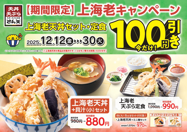「天丼・天ぷら本舗 さん天」は12月12日~30日の期間、「上海老キャンペーン」を実施します。