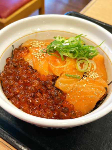 サーモンはなか卯の海鮮ではテッパンで、ファンも多いと聞きます。今回は、そこに天然いくらを合わせた豪華な「サーモンいくら丼」を注文してみました。