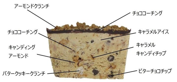 キャラメルアイスの中には、キャンディングアーモンドやチョコチップなど5種類の素材を組み合わせており、濃密で香ばしい味わいと、ザクサクパリッと多様な食感が楽しめるといいます。
