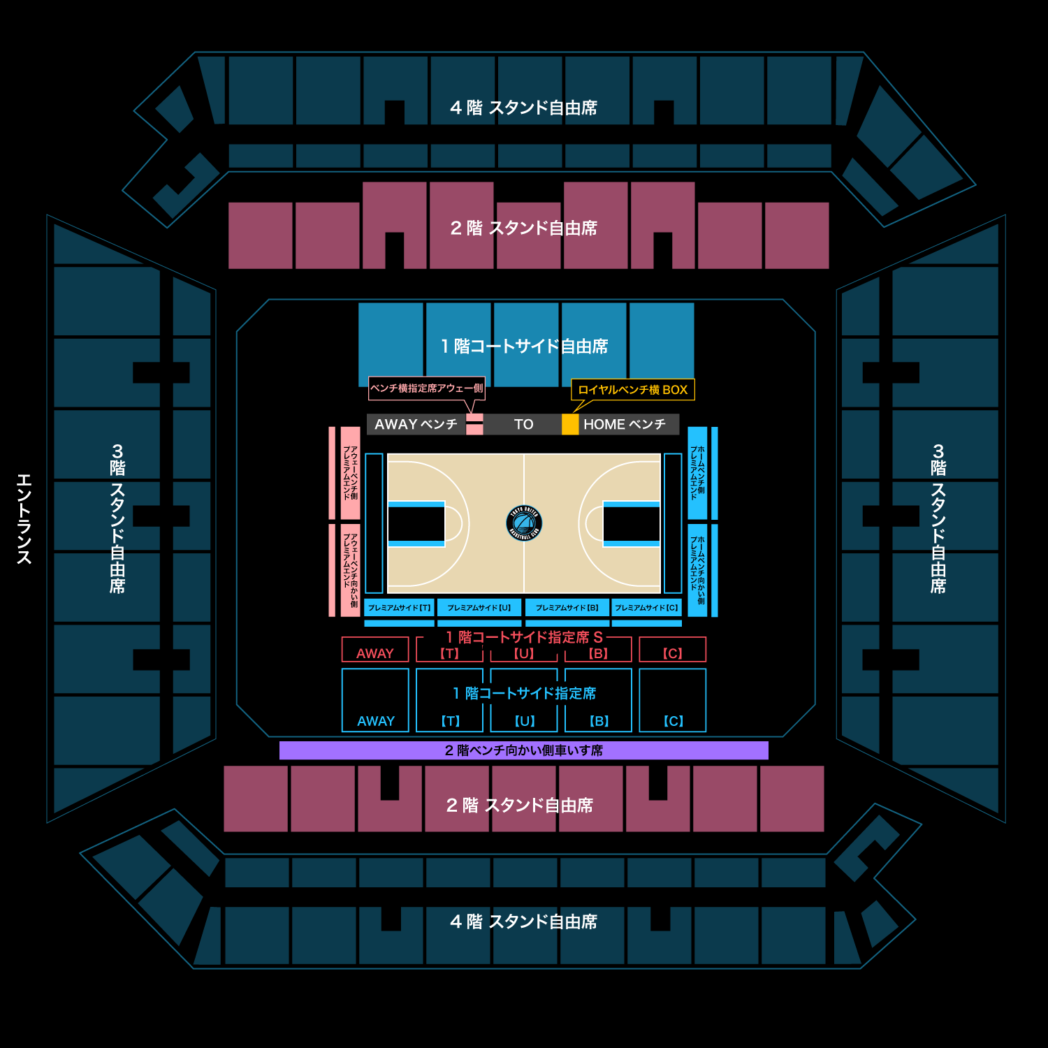 ※1階コートサイド指定席Sは1~5列目となります。6列目以降が1階コートサイド指定席となります。