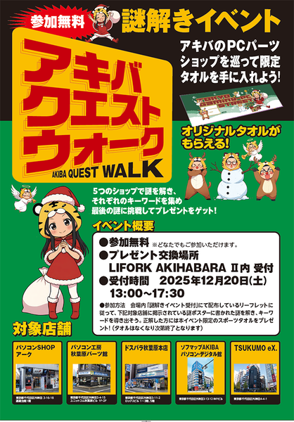 ●会場内「謎解きイベント受付」にて配布しているリーフレットに従って、下記秋葉原店舗に掲示されているポスターに書かれている謎を解き、キーワードを導き出してください。正解した方に本イベント限定のスポーツタオルをプレゼントいたします。タオルは無くなり次第終了となります。