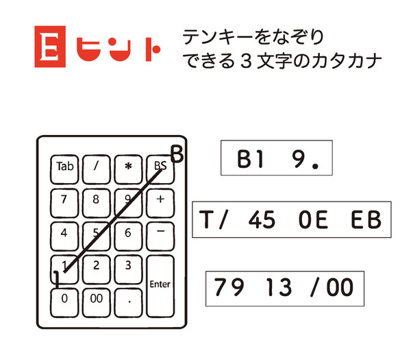 「B1」は「BS」と「1」を結ぶ線。「9.」は「9」と「.」を結ぶ線を表している。その2本の線を合わせると、カタカナ一文字が浮かび上がる。