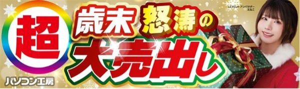 「超 歳末怒涛の大売出し」では、パソコン工房全店舗で『オススメ即納パソコン』や『日替わりセール商品』を大特価で提供する。加えて、eスポーツプロプレイヤーとのコラボPC「LEVEL∞」や、カラーバリエーション豊富な「LEVELθ」、高品質なカスタムPC「iiyama PC」など、多彩な選択肢を揃えている。これらの製品はアップグレードや出張設定サービスも利用可能で、店頭スタッフによるアドバイスも受けられるという。