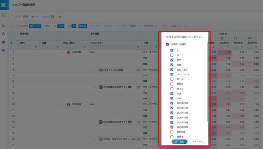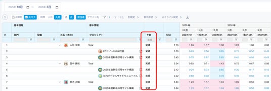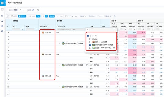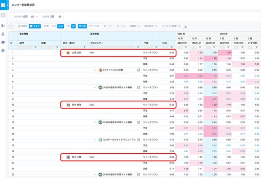 1️⃣「メンバー別負荷状況を一覧表示」メンバーごとに全プロジェクトの予定工数・実績工数・リソースプランを集約し、横断的に稼働状況を一覧で可視化します。